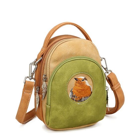 En nätt hand- och axelremsväska i persika, grönt och orange med broderi av en rödhake framtill. En charmig liten väska som rymmer det viktigaste och passar perfekt både till vardag och kväll.