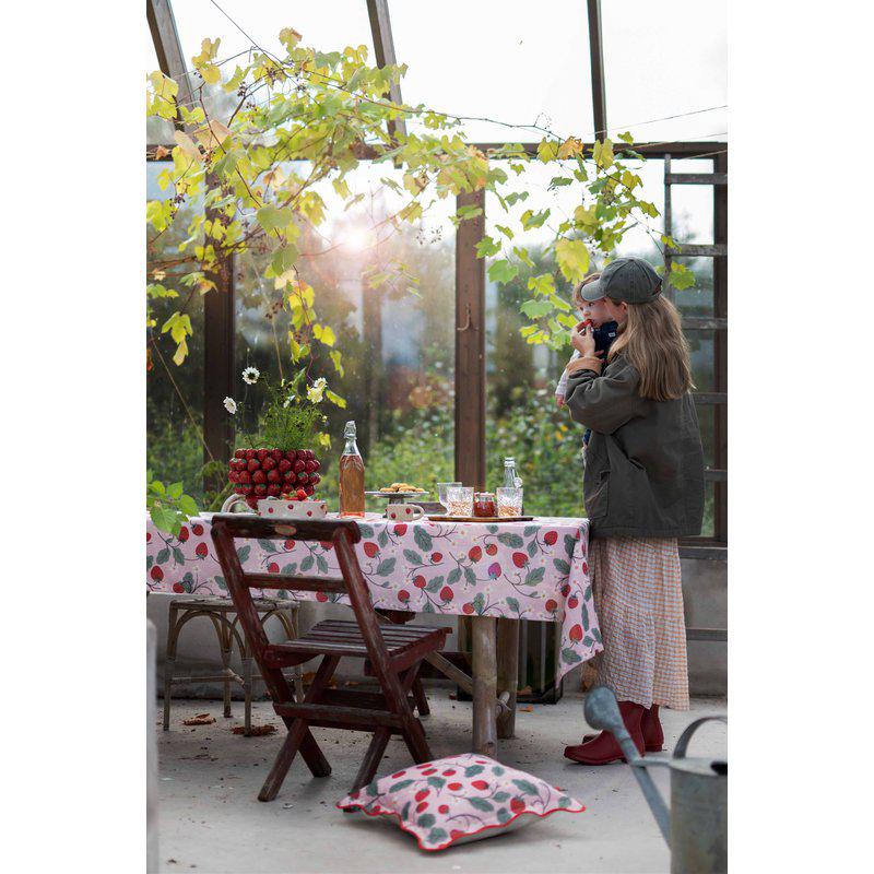Duk med ett söt jordgubbsmönster som andas ren sommaridyll. Rosa botten dekorerad med små röda jordgubbar och gröna blad som ger liv åt mönstret.