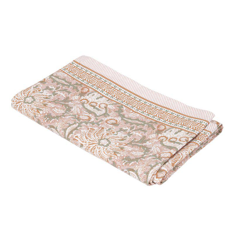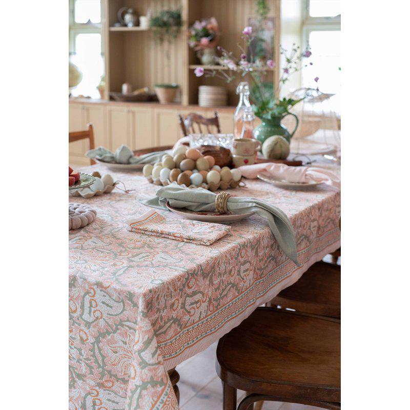 Duk i en härlig bomull. Vackert mönster i rosa, bränd orange, vit och gröna detaljer. Tidlös design som blir ett vackert blickfång i hemmet.