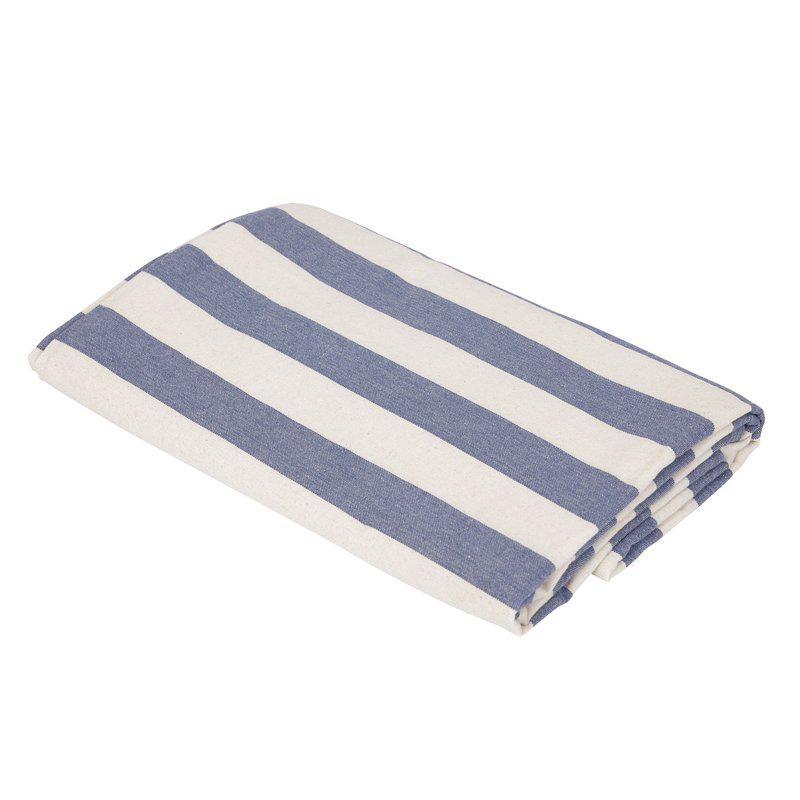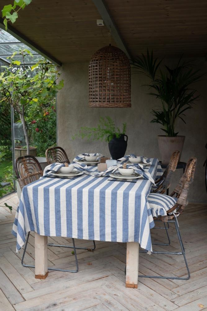 Duk i en härlig bomullsmix, bredrandigt i klassiskt blått och vitt. Tidlös och marin design som blir ett vackert blickfång i hemmet.