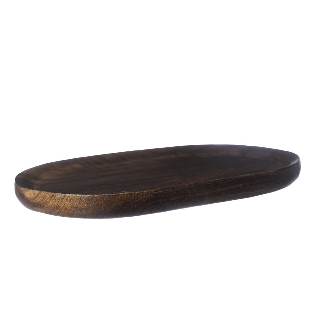 Trevlig oval mörkbrun träbricka för servering eller dekoration.