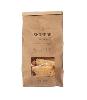 En påse skorpor med smak av saffran, i en rustik förpackning av brunt kraftpapper.