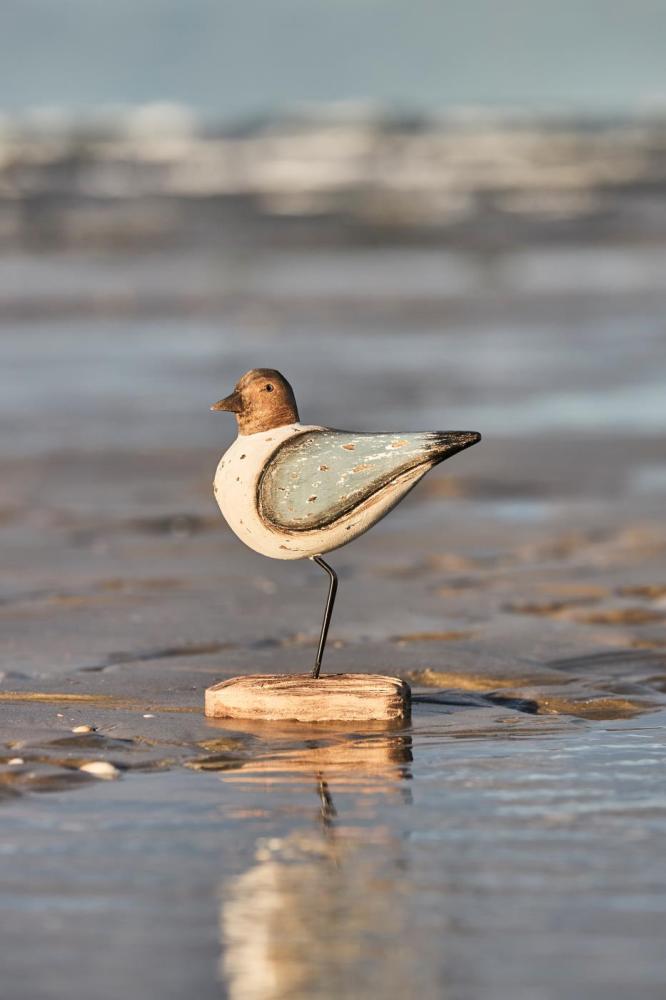 Festlig fågel i trä. Vit med brunt huvud, blågrå vingar och svart stjärt.