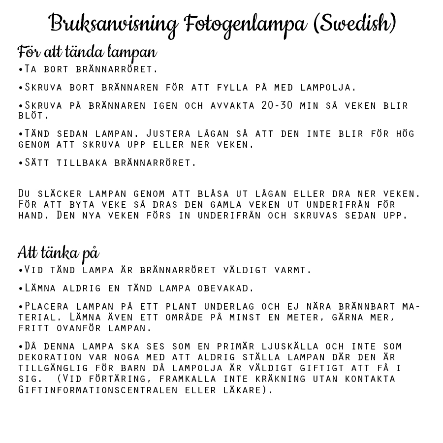 Lampolja säljs separat.. Använd gärna Strömshagas egna lampolja (art nr 100001) till denna lampa.