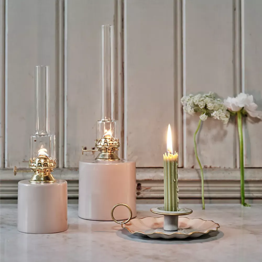 Stilren fotogenlampa i en skön beige färg med rakt brännare rör