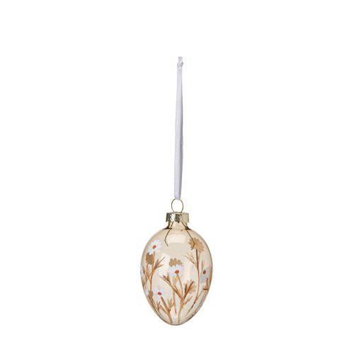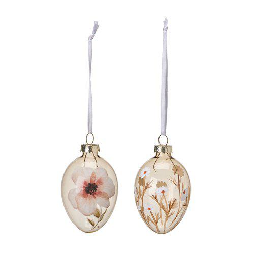 Dekorativa glasägg. Kommer i en låda om 6 stycken; 3 med en blomma samt 3 med flera små blommor i mjuka, sköna toner.