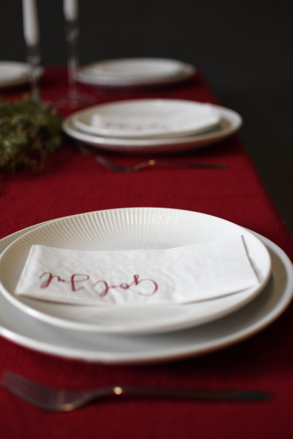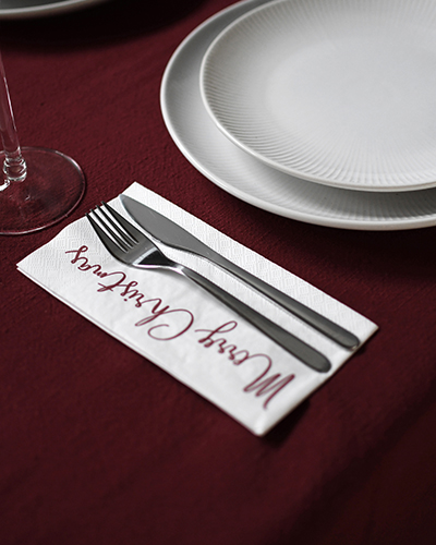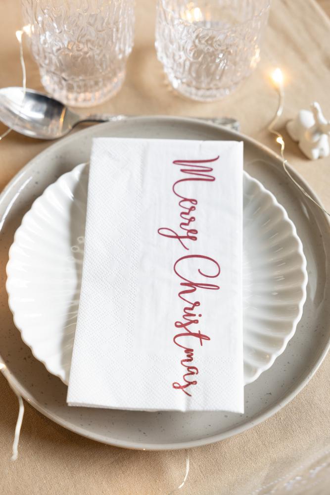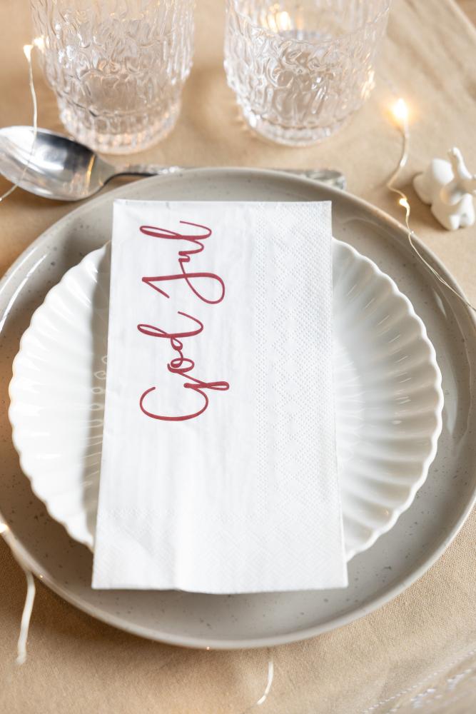 Välj framsidan av servetten för “God jul” på svenska eller baksidan för texten “Merry Christmas”.