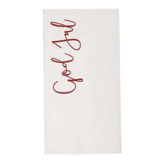 Dekorativ och stilren Julservett, vit med sirlig röd text.