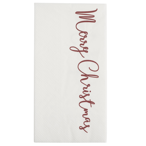 Vit servett med röd text: God Jul på ena sidan - Merry Christmas på andra