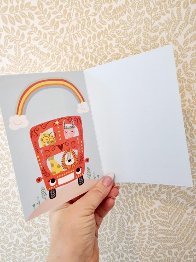 Ett dubbelt kort med motiv av en röd buss där olika djur tittar ut