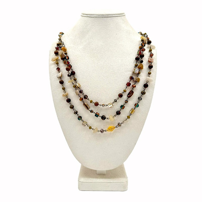 Fint halsband med tre rader i olika längd, fyllda med stenar i olika form och i harmonierande toner i den bruna färgskalan.