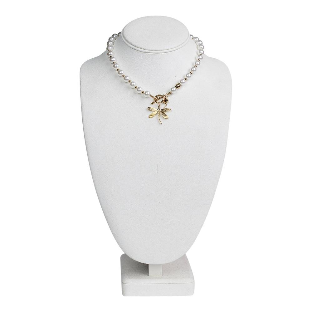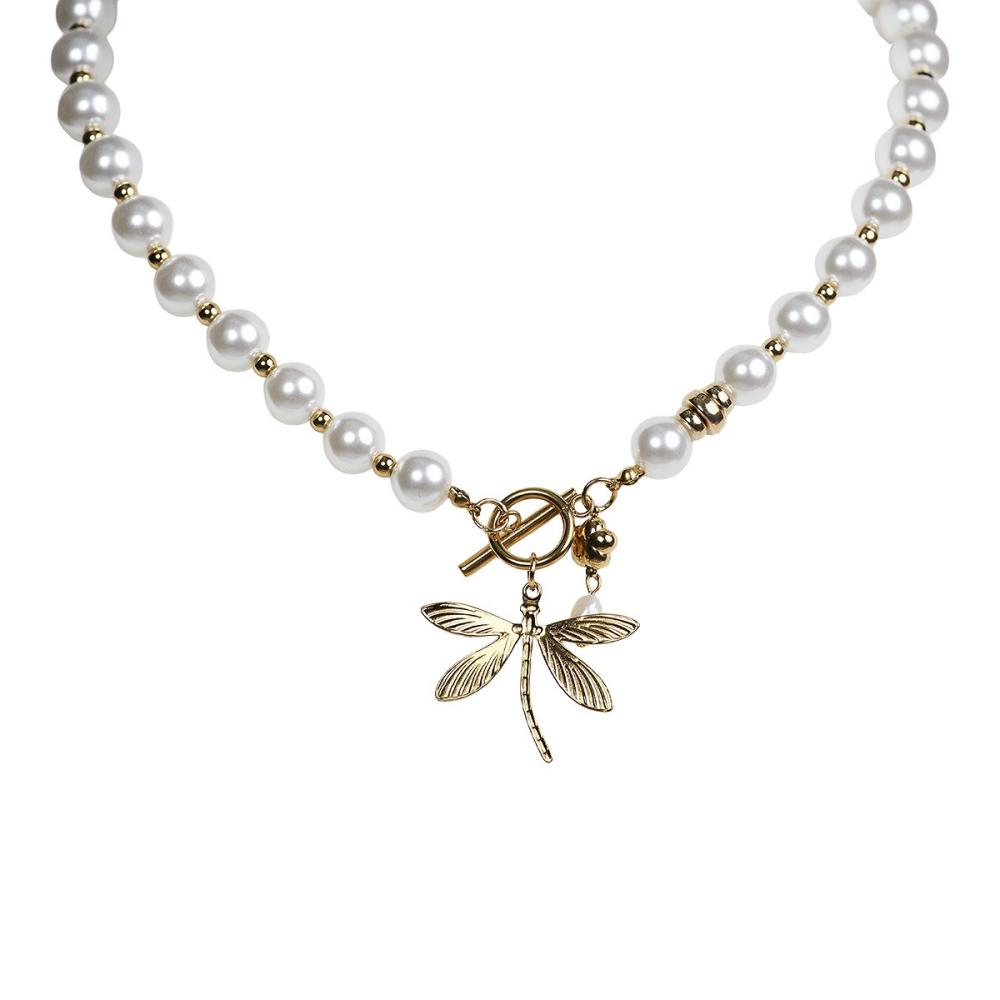 Halsband Kort, Cremevita pärlor med en hängande trollslända (Rostfritt stål), Carole - the moshi