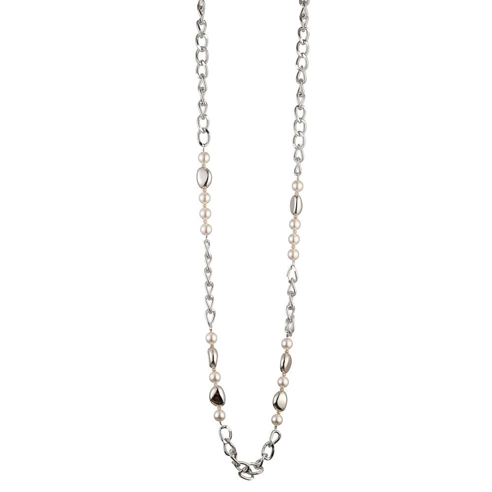 Elegant lång kedja, varvad med vita pärlor och silverfärgade oregelbundna pärlor