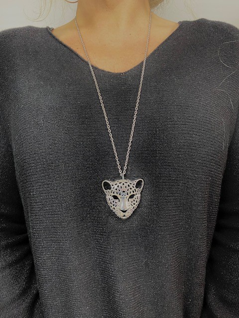 Coolt halsband som förhöjer outfiten; leopardhuvud i en lång silverfärgad kedja.