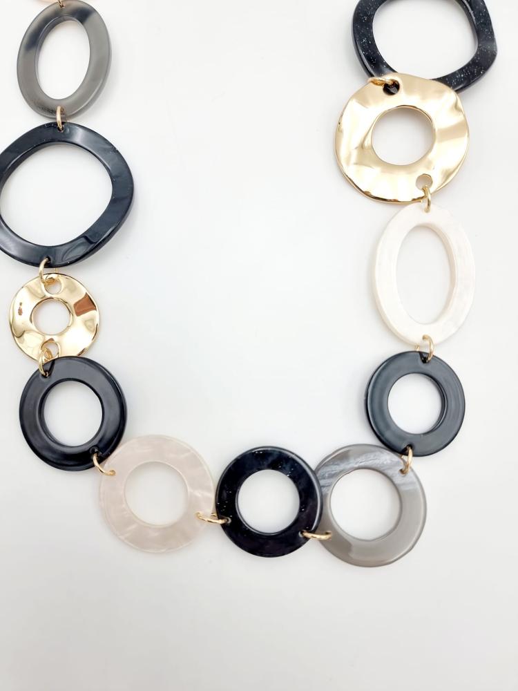 Ett halsband som syns! Stora ringar i olika varianter, i svart och guld. Lite glitter i de svarta ringar och pärlemor i de cremefärgade.