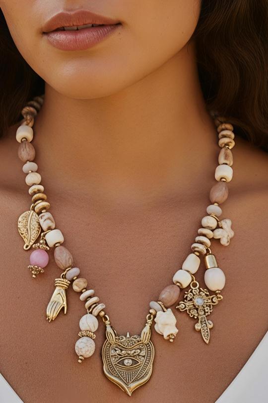 Halsband med berlocker i beige och guld, Mimiko - Reunion