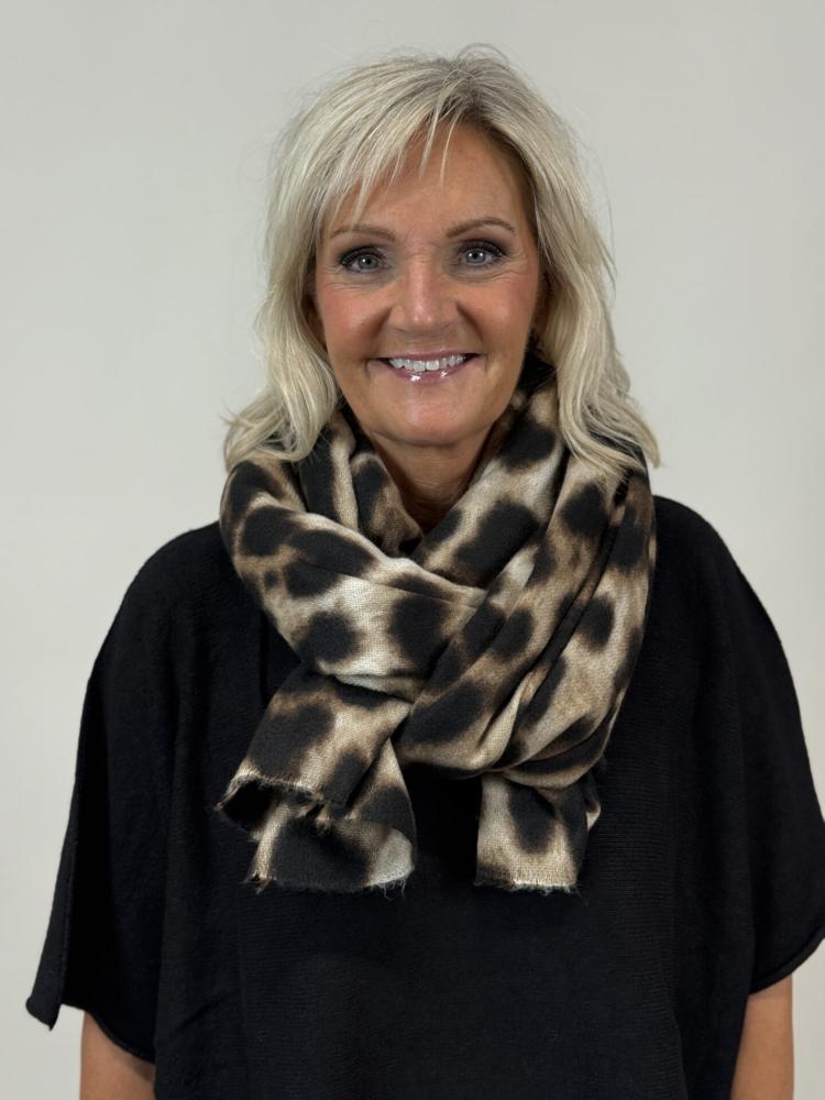 Mjuk och skön halsduk i leoprint i jordnära bruna nyanser.