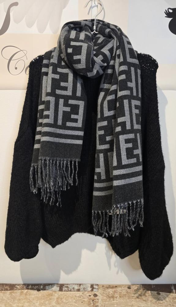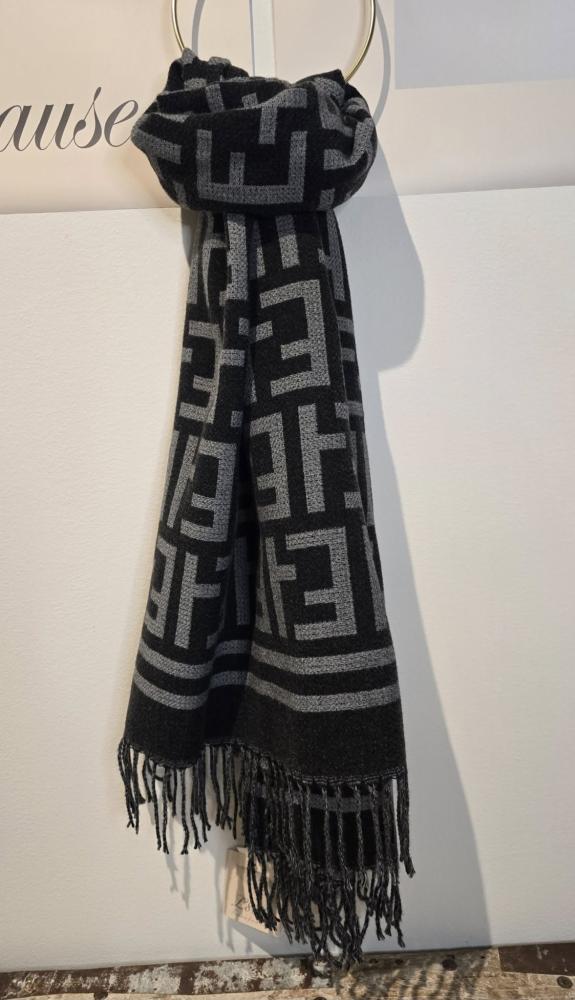 Halsduk med fransar, Grafiskt mönster, Svart / Grå, Seline - Soulful Fashion