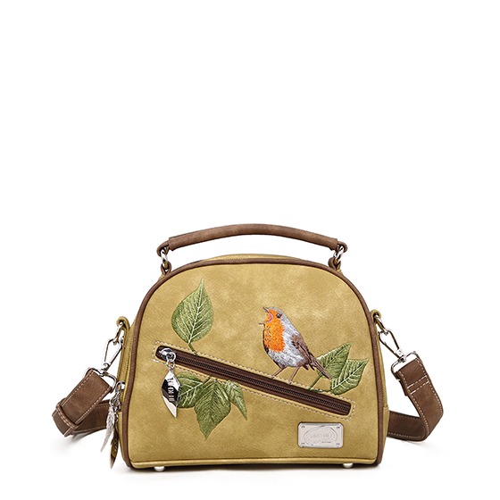 Hand- och axelväska Rödhake – grön och brun med broderade blad