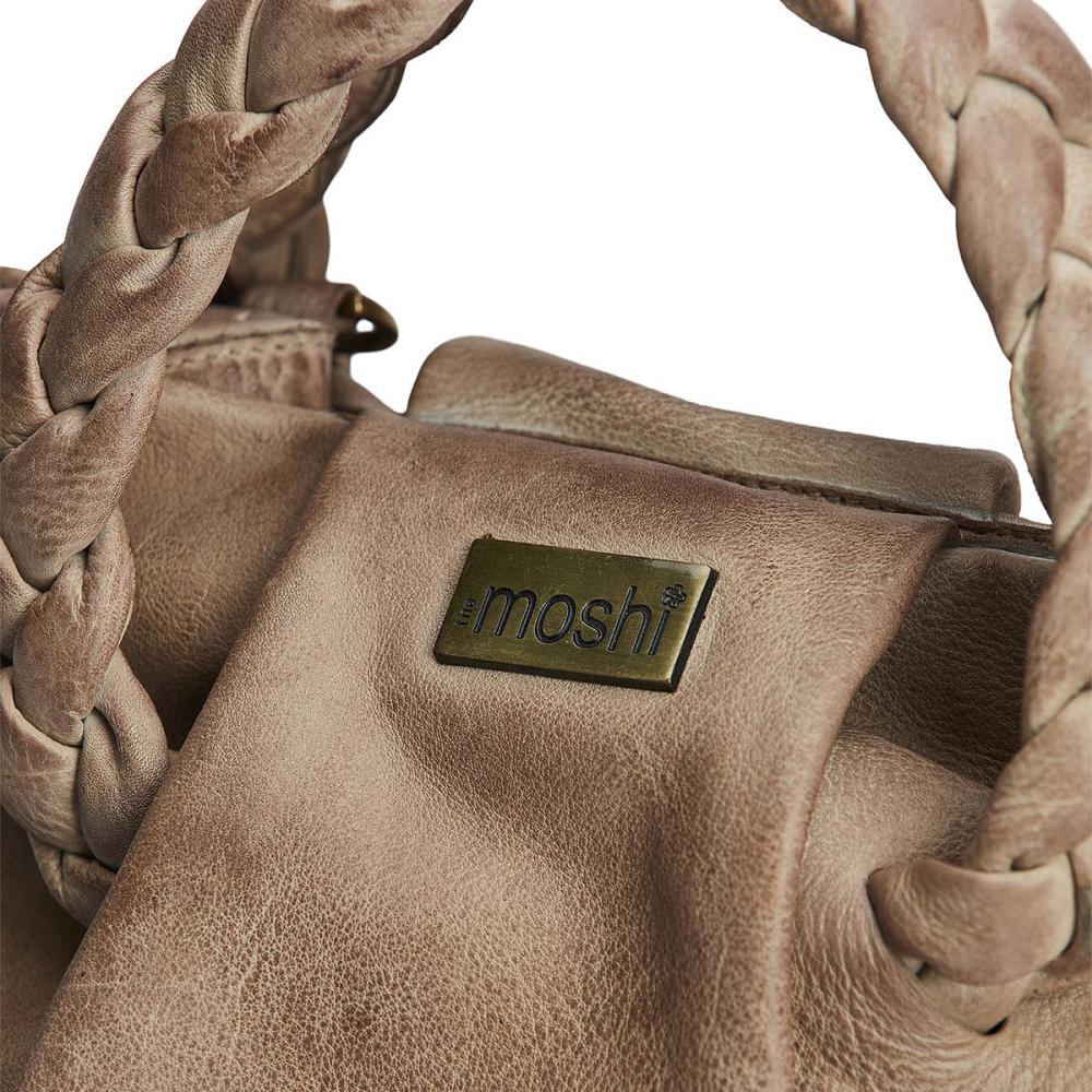 skinnväska dam, handväska i läder, väska med flätade handtag, taupe väska, the moshi