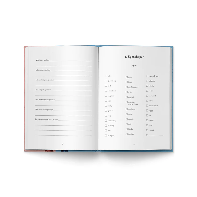 Boken hjälper dig att blicka tillbaka över de gångna åren, att skåda framåt och mest av allt: att lära känna dig själv. Kryssa för, fyll i och få en överblick över alla de egenskaper och erfarenheter som gör dig till den unika person du är.