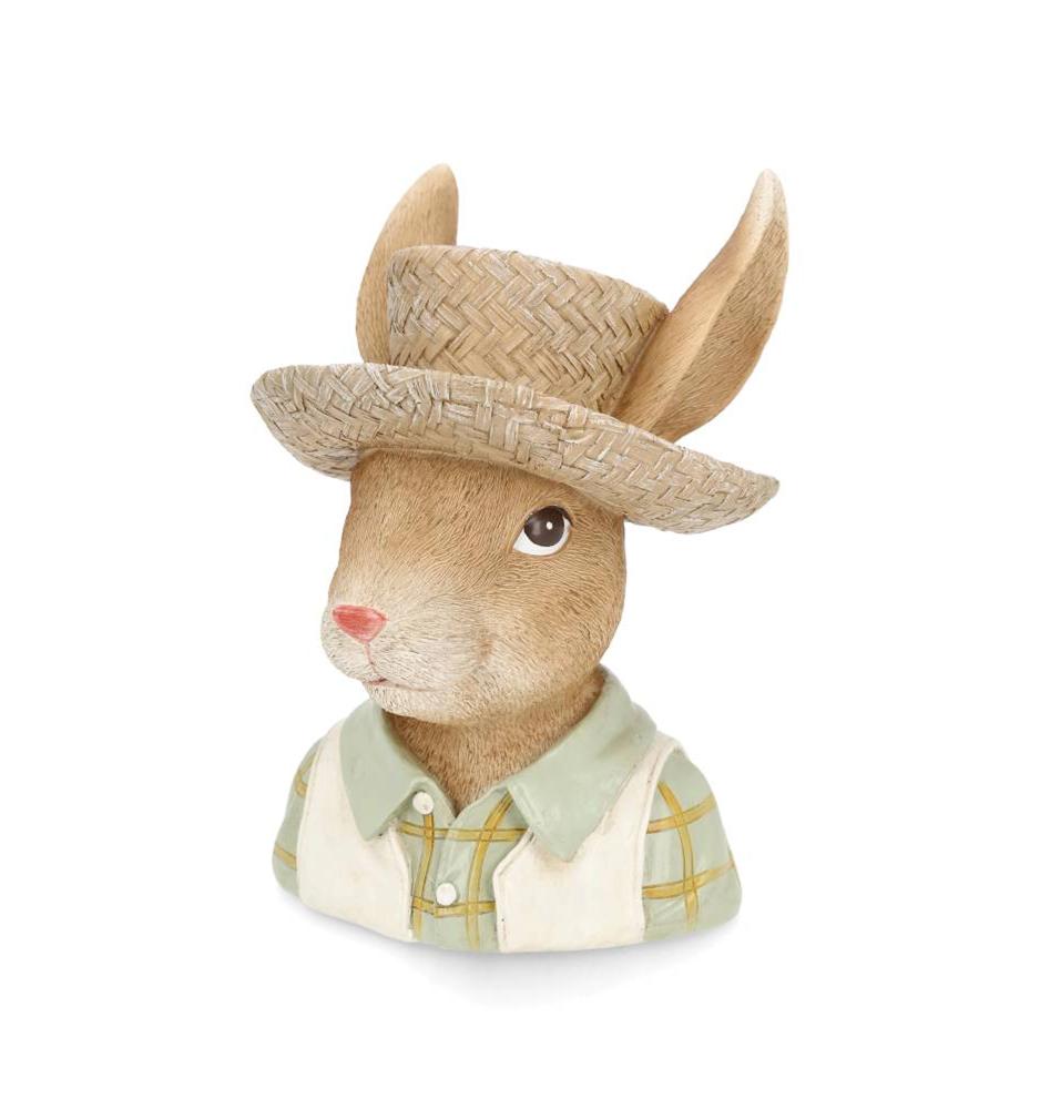 En byst med en ljusbrun kanin / hare med stråhatt samt del av grönrutig skjorta och ljus väst.