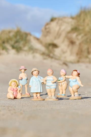 Dekoration med lekfulla damer iklädda olika utstyrslar inför ett dopp i havet