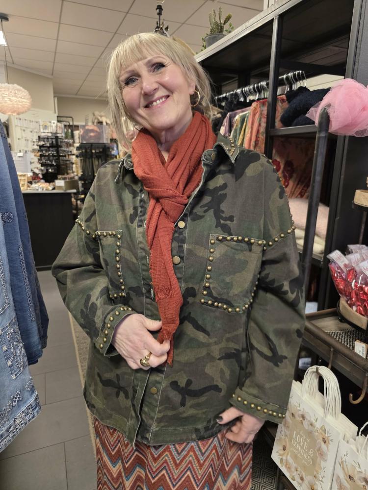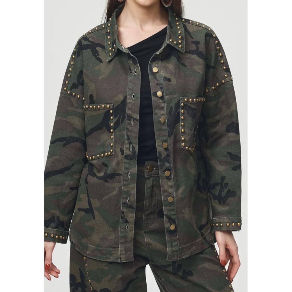 Snygg camomönstrad jacka i klassisk armygröna toner. Festliga detaljer som nitar på krage, axlar, bröstfickor och i ärmslutet. Både nitar och knapparna är i antikguld metall. Jackan är i lite skjortmodell, sk shacket.