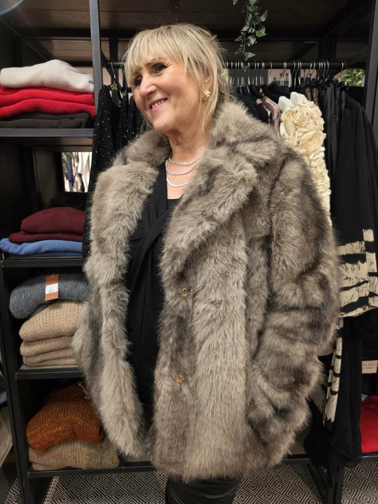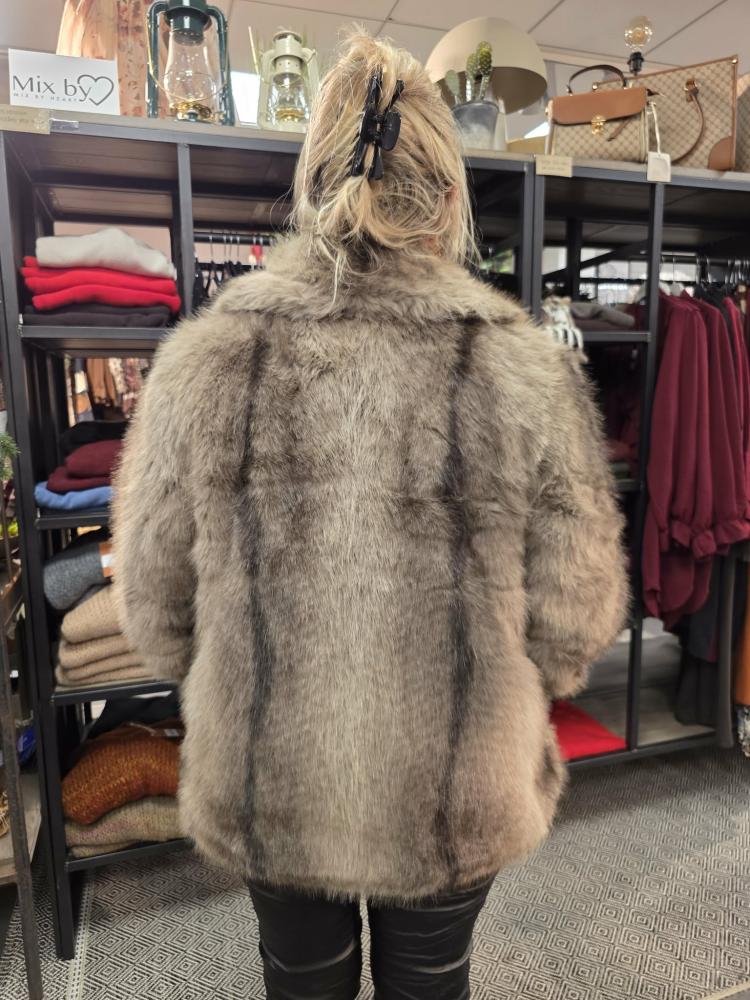 En lyxig jacka i fuskpäls med mjuk och fyllig känsla som håller dig varm samtidigt som den adderar glamour till din outfit. Ränder i pälsen gör att den "sticker ut" lite.