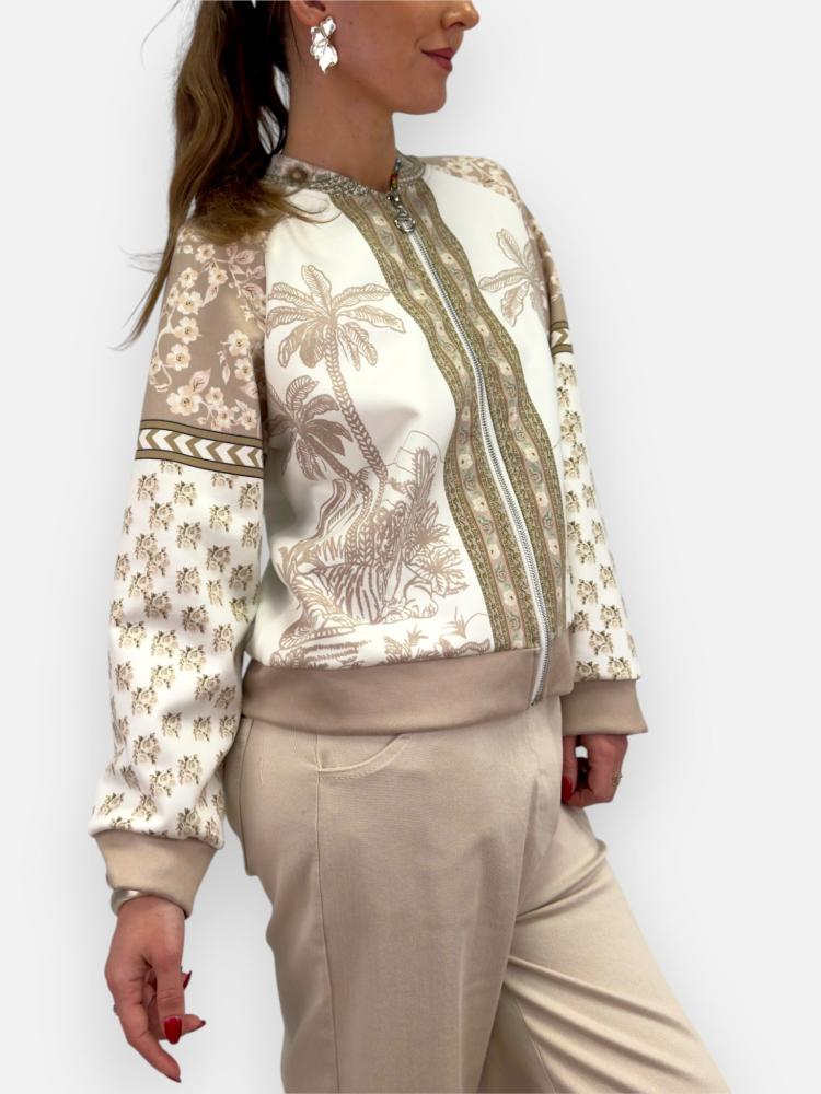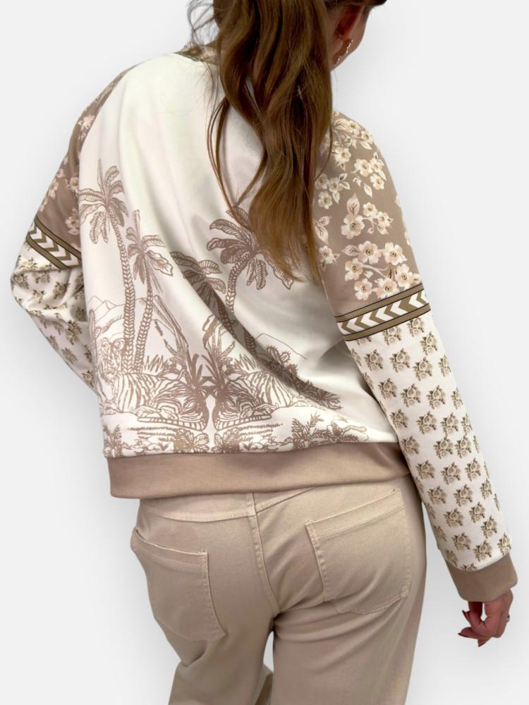 En trevlig jacka / tröja med dragkedja fram, i ett otroligt mjukt och skönt material. Härligt print i beige och taupefärgade toner med bla blommor och palmer. Taupefärgad mudd nertill samt i ärmslut. Trevligt alternativ istället för kofta.