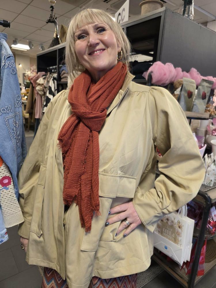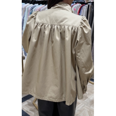 Snygg vårjacka i klassisk sandfärgad ton. Festliga detaljer som rynk vid axlar och rygg, lite boxig ärm som avslutas med manschett. Knappar och fickor med lock fram.