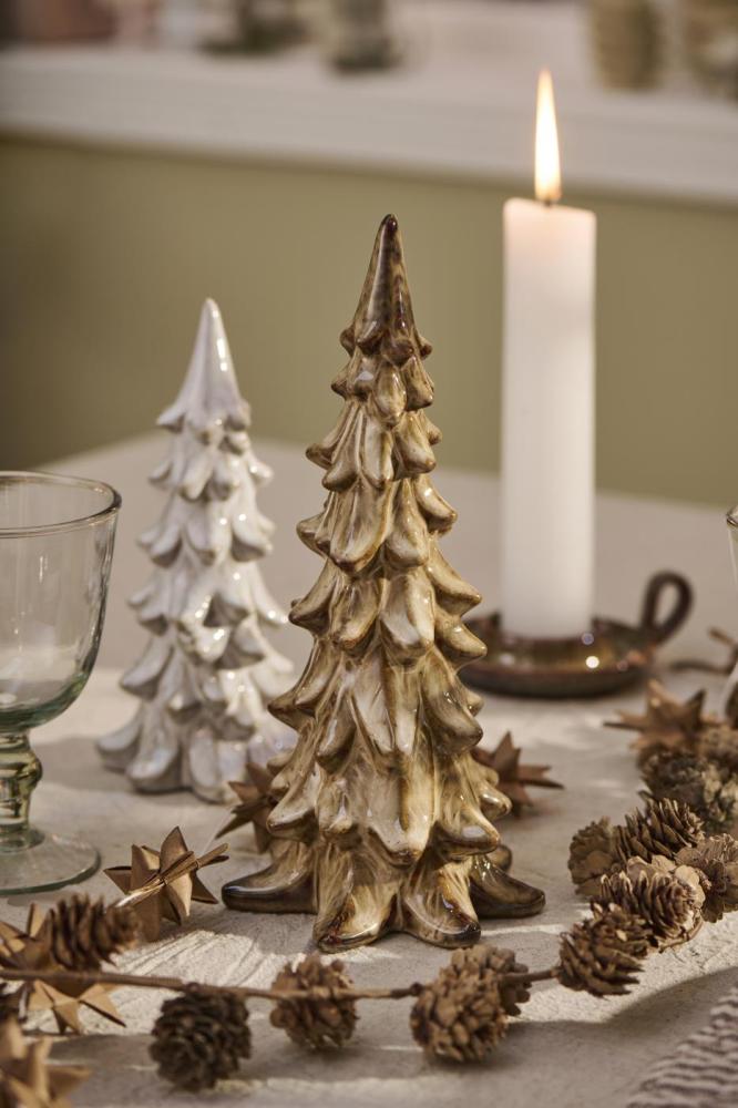 Vacker brunmelerad julgran i keramik, perfekt för att skapa en naturlig och stämningsfull juldekoration.