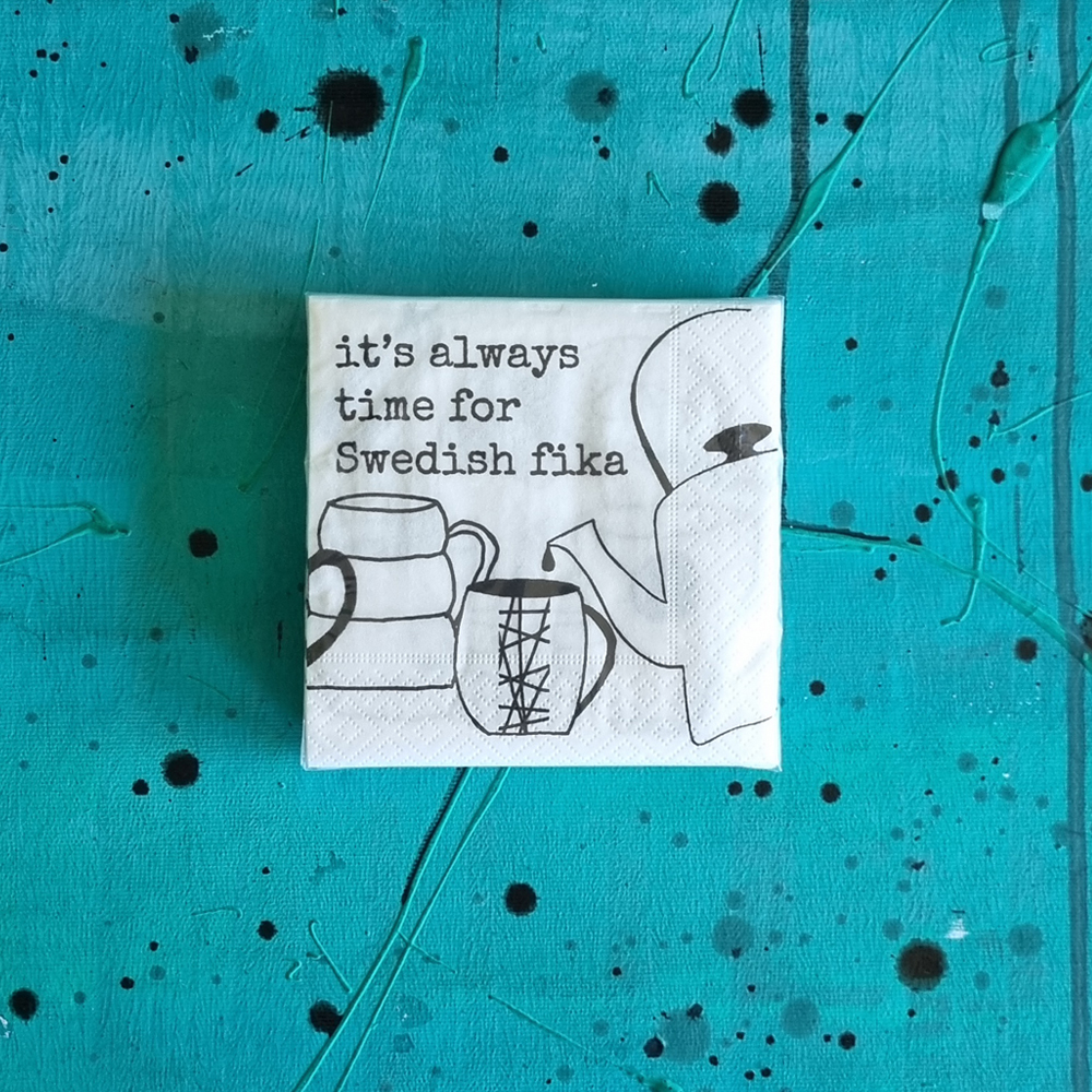 Servetter med tryck som älskas av alla fika-dyrkare. Kaffeservetter i 20-pack med texten "it's always time for Swedish fika"