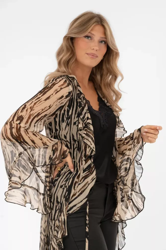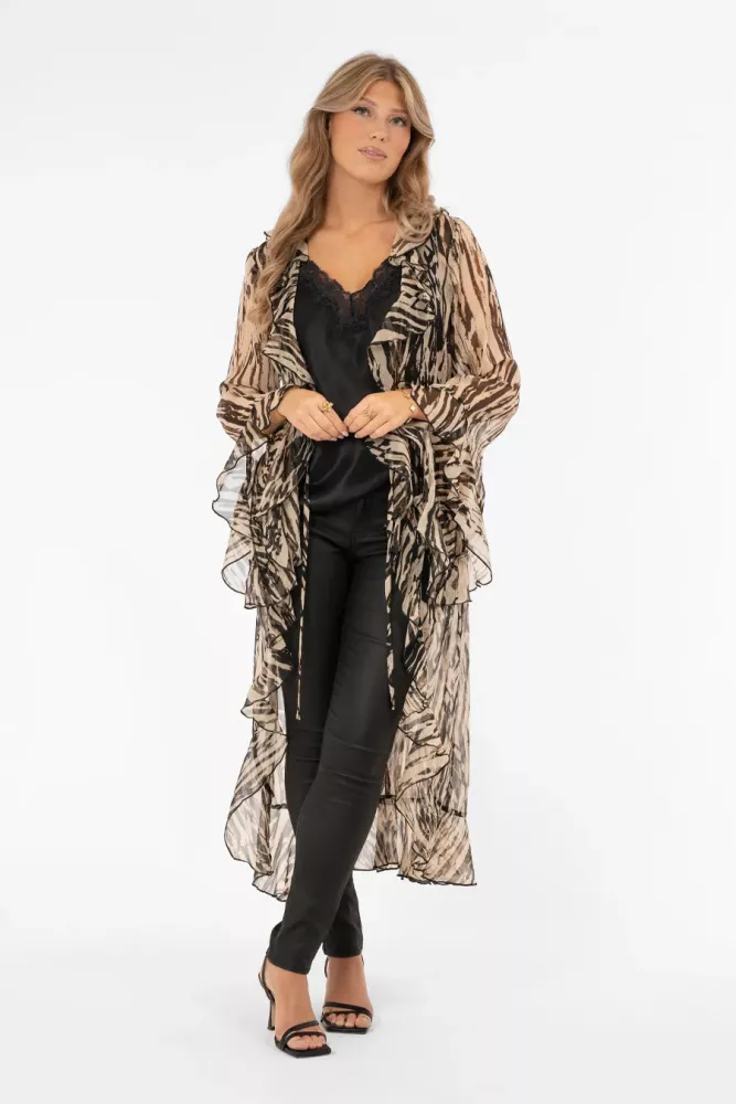 En uttrycksfull kaftan med abstrakt mönster och en tydligt feminin men samtidigt kaxig känsla. Modellen har resår i midjan baktill och smala knytband framtill som gör passformen justerbar och smickrande. De breda volangerna som löper längs hela framkanten och runt nederkanten skapar ett vackert fall och ger plagget rörelse och karaktär.