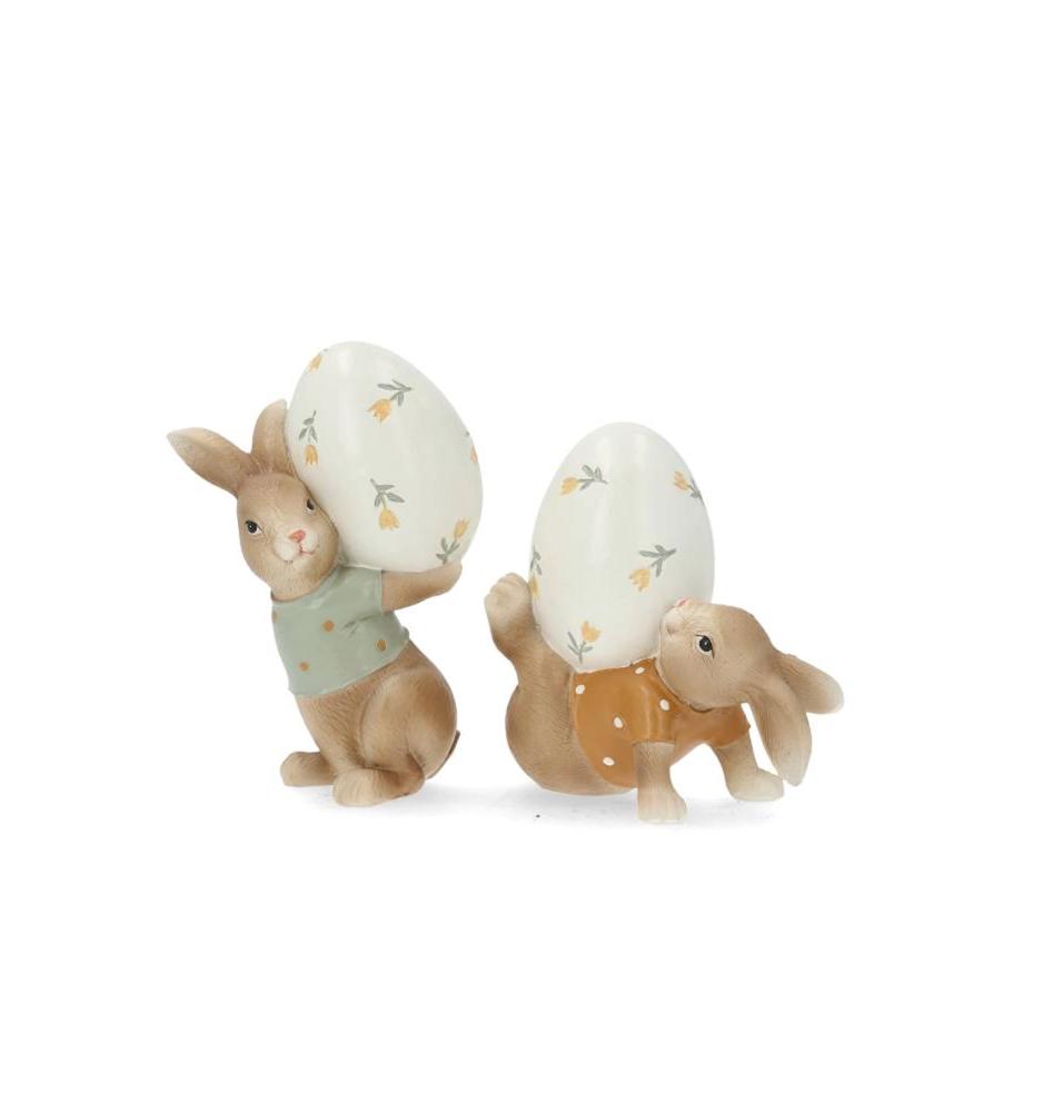 En dekoration i form av en kanin med prickig tröja, hållandes ett vitt ägg med små gula tulpaner på.