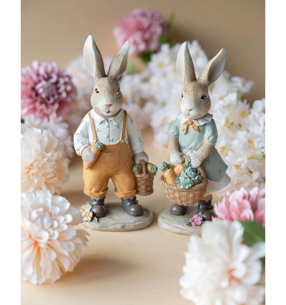 En dekoration i form av en tjejkanin i grön klänning med orange scarf i halsen eller en kille med orange hängslebyxor och vit mönstrad skjorta under. Båda håller i en korg full med morötter. Välj tjej, kille - eller båda.