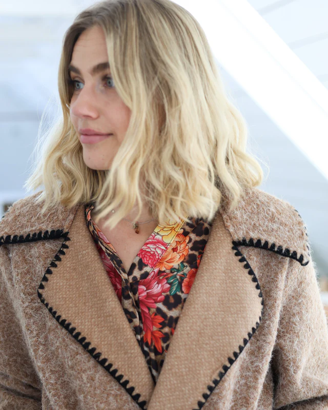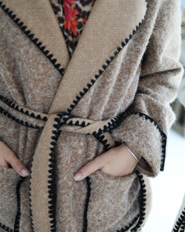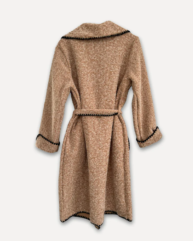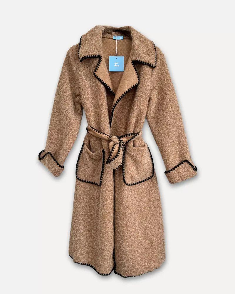 Kappa Cosy från Reunion Home är den perfekta kombinationen av en stor mysig kofta och en stilren kappa. Den oversized designen ger ett avslappnat men elegant intryck, och det mjuka polyestermaterialet gör den både skön att bära och lätt att röra sig i. Med laskade kanter i kontrastfärg, en klassisk krage och ett band att knyta i midjan, är denna ofodrade kappa lika trendig som praktisk. Fickorna ger extra funktion och gör den till ett perfekt val för kyligare dagar.