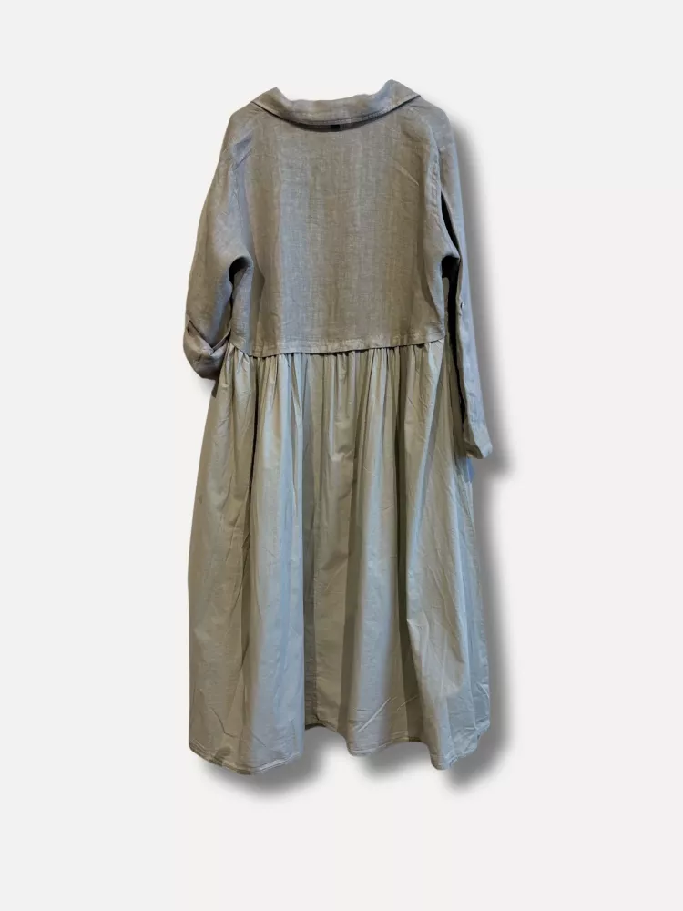 Lång linnekappa, där ovandelen är i 100% linne - sidstycken och nertill bak, är i bomull. En cool mix av två härliga naturmaterial ger karaktär åt denna användbara kappa med trevliga detaljer och bra vidd.