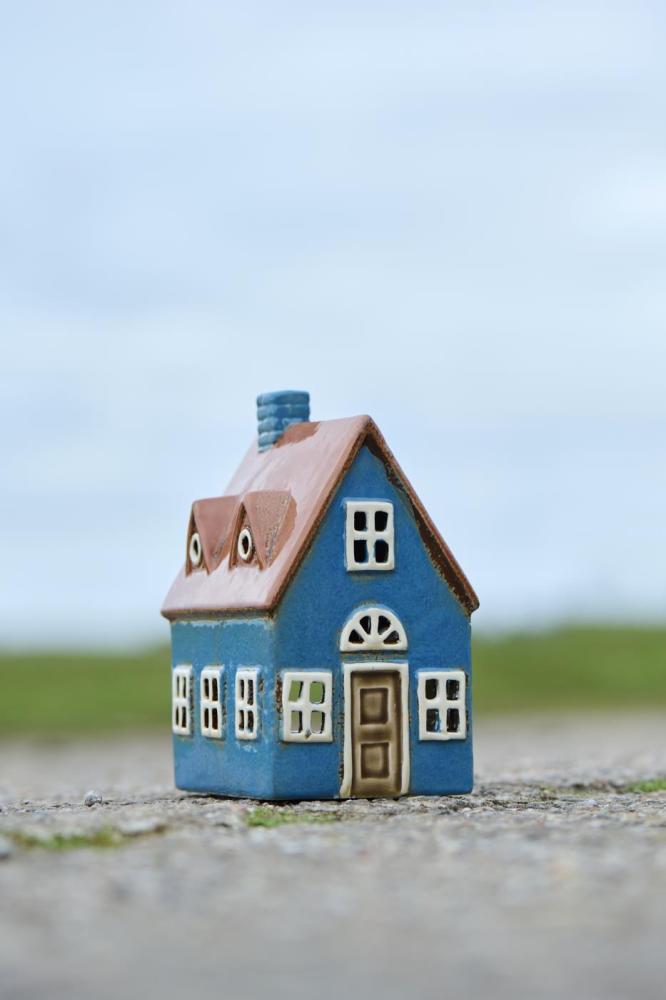 Trevligt hus för värmeljus, Blått hus med brun dörr och ljusa fönster och rödbrunt tak.