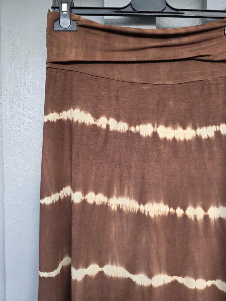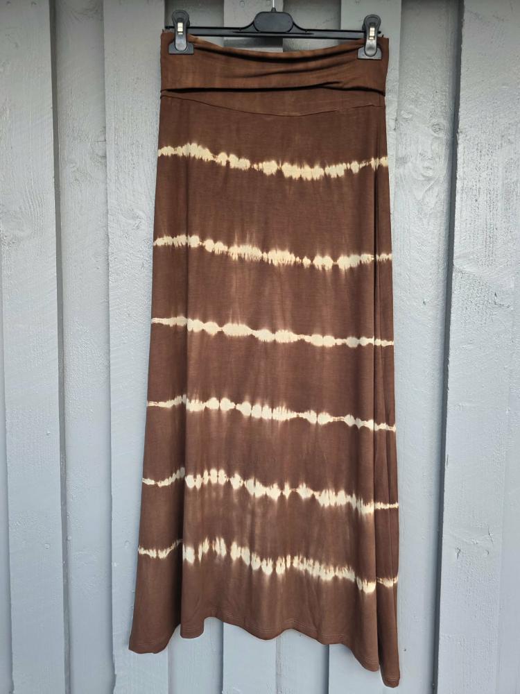 En otroligt mjuk och skön lång kjol i stretchig trikå. Bred mudd i midjan som kan vikas upp - och dras över bysten, för att användas som en klänning. Lite längre i sidorna än fram/bak. Effektfulla cremefärgade ränder på brun botten.