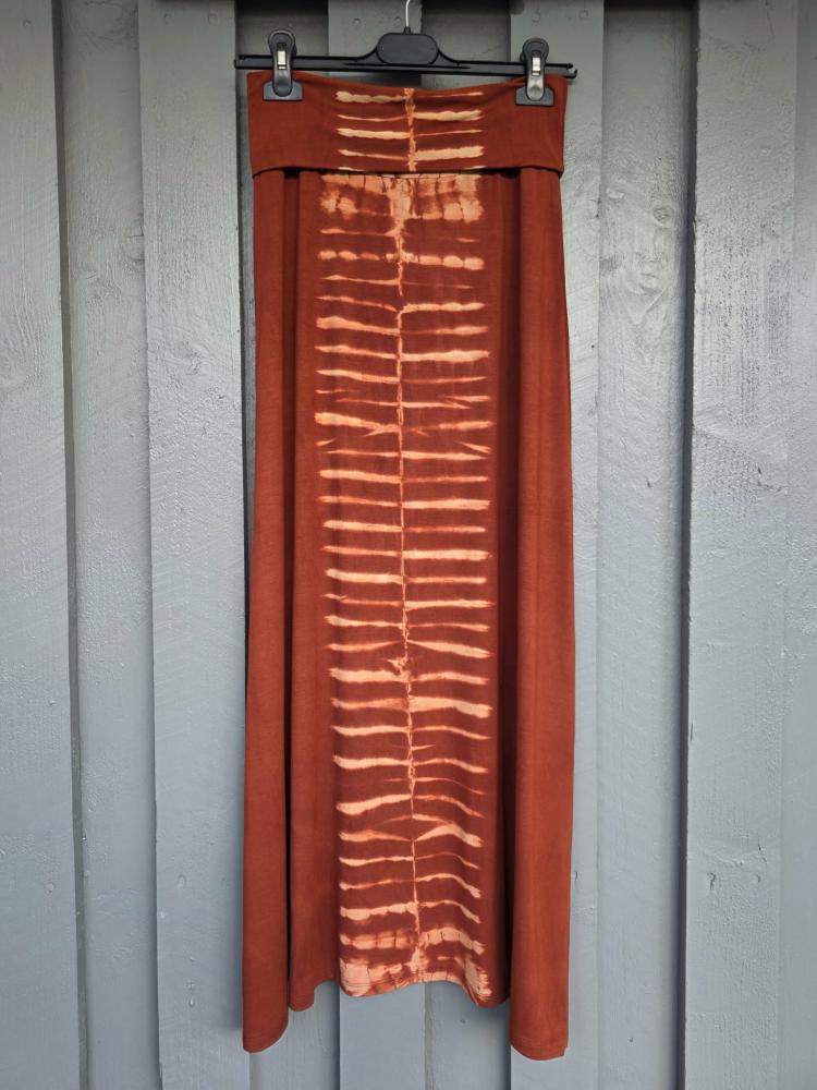 En otroligt mjuk och skön lång kjol i stretchig trikå. Bred mudd i midjan som kan vikas upp - och dras över bysten, för att användas som en klänning. Lite längre i sidorna än fram/bak. Effektfullt cremefärgat mönster på tegelfärgad botten.