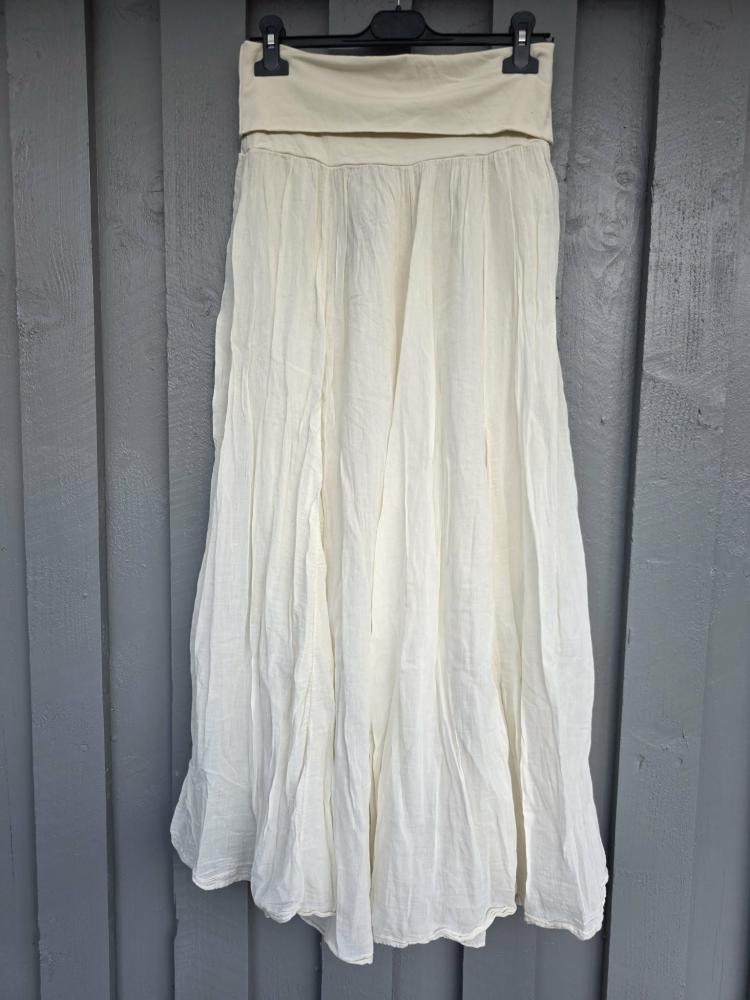 Cool lång kjol i ett par lager tunn bomull. Underkjolen är kortare än översta lagret tyg. Bred mudd i midjan, som kan dras upp över bysten och användas som klänning. Addera ett linne, jeansjacka ett par boots eller sneakers.