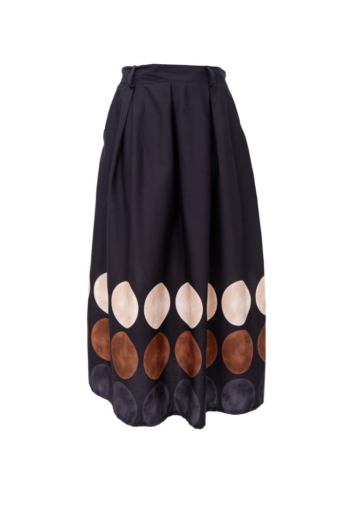Svart kjol med stora prickar i sand, brunt och svart - i en trendig modell. Skön kvalité, bomull med lite elastan som ger extra glamour. Platt linning fram - resår bak. Fickor samt hällor i midjan.