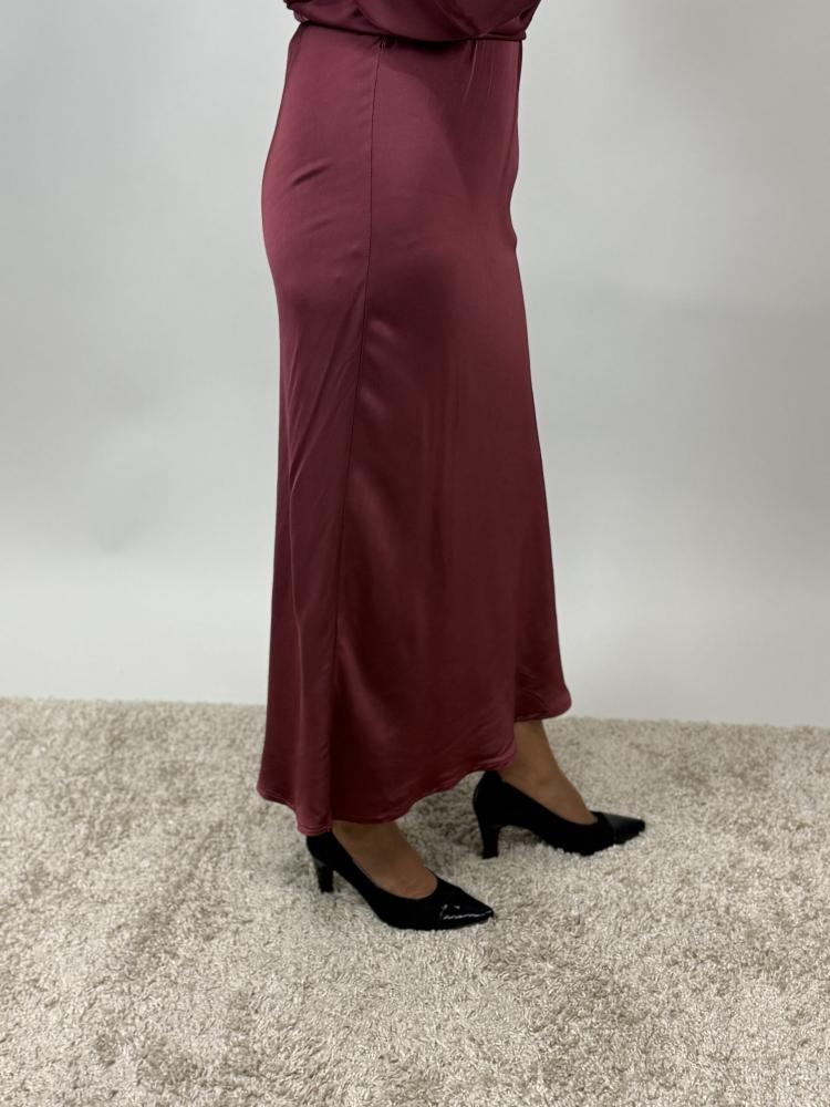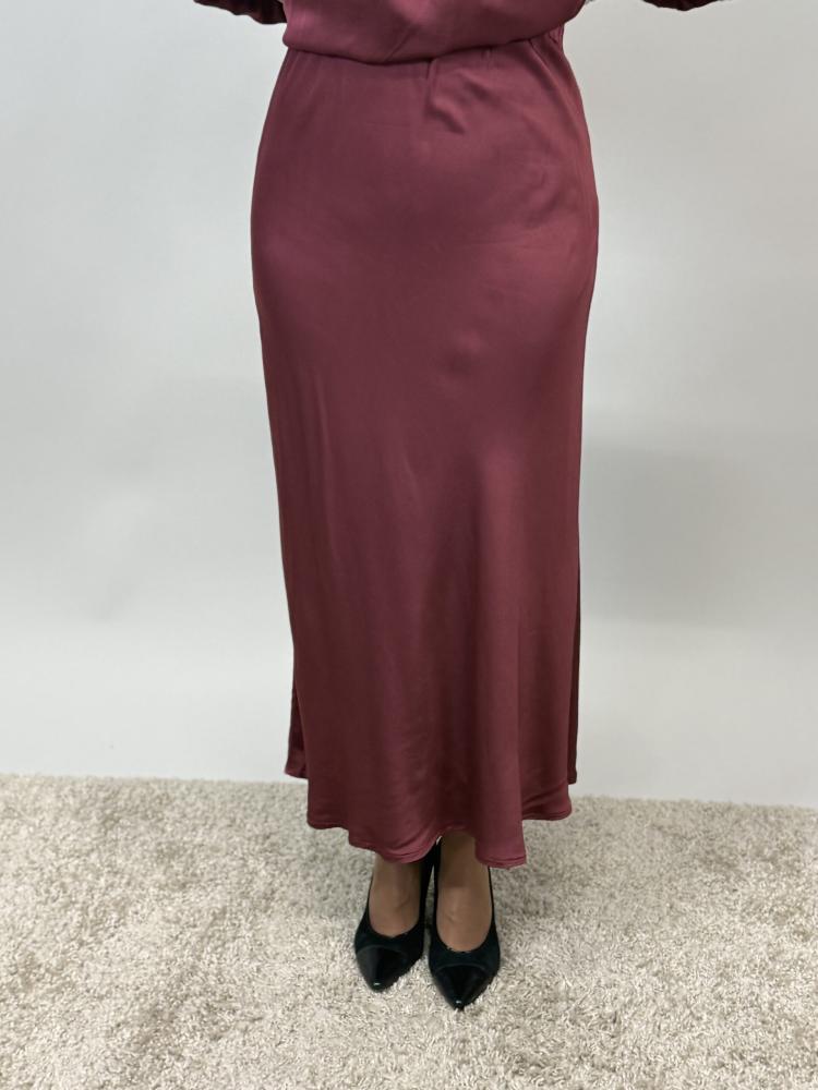 Snygg vinröd kjol i glansig viskose. Resår i midjan.