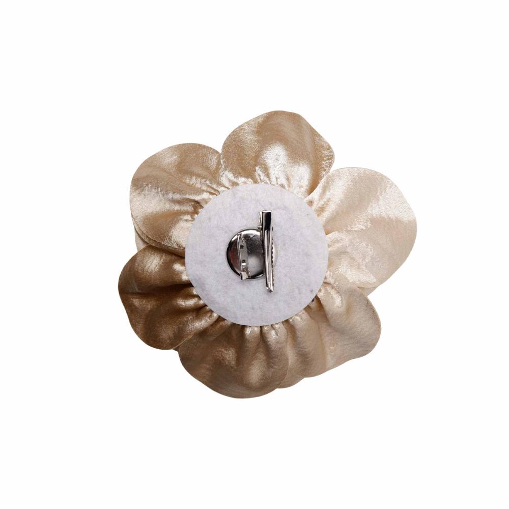 Guldfärgad blomma i glansigt material, med fäste för både klämma till ex håret - samt nål om man vill använda den som brosch. Piffar snabbt och enkelt upp den enklaste topp, klänning, tröja...
