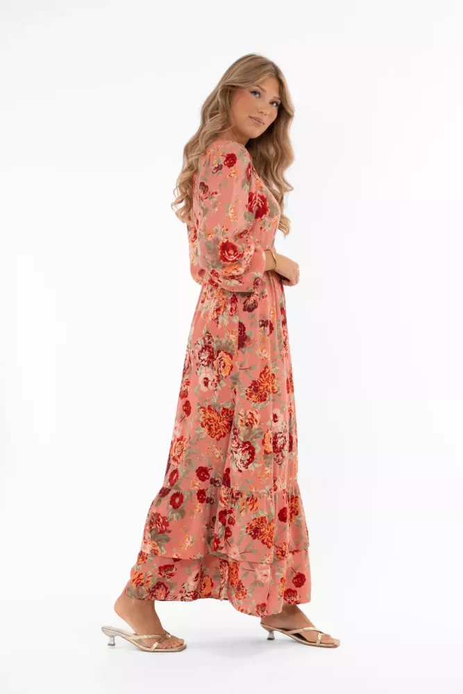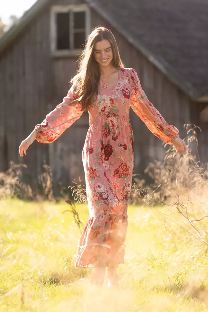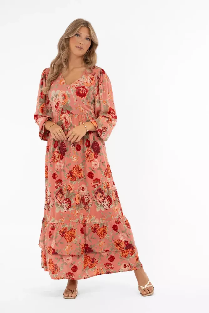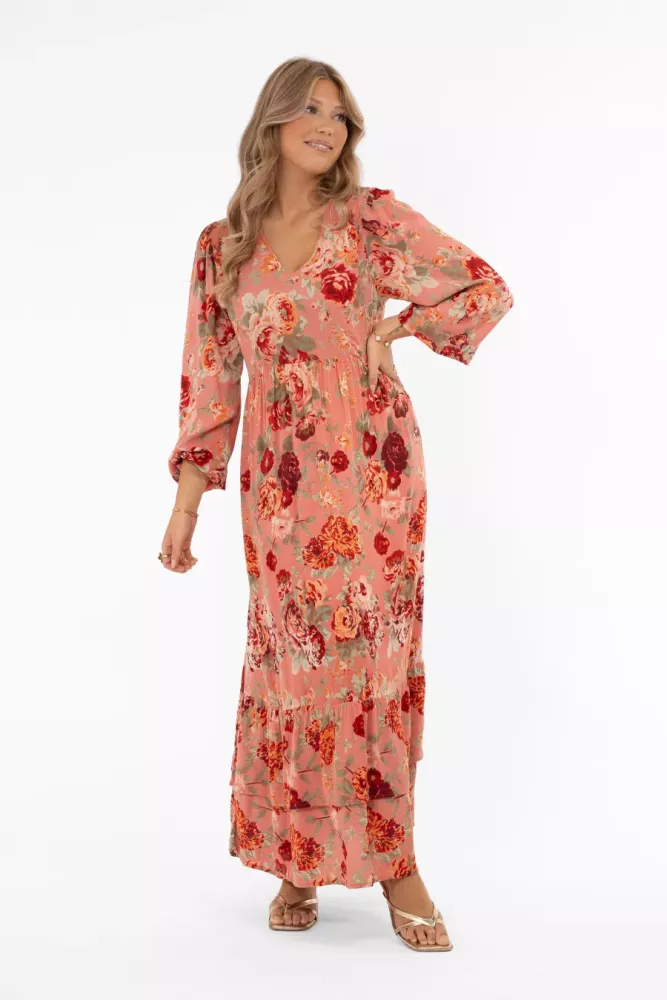 Ambrosia Klänning – en feminin v-ringad blommig klänning med hellånga ärmar och volang i nederkant