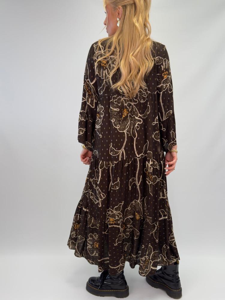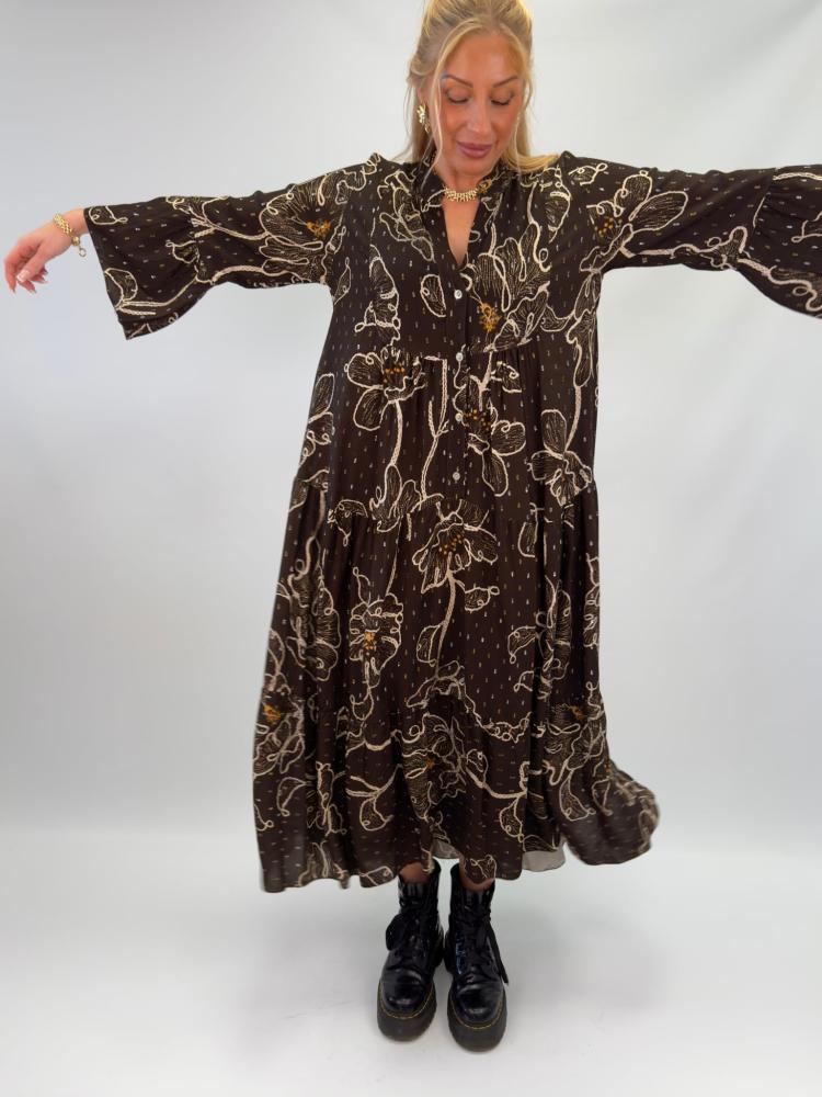 Freja är en vacker långklänning i viskos som kombinerar elegans med avslappnad komfort. Den har ett mjukt fall och ett harmoniskt blommönster som ger en bohemisk känsla. De vida ärmarna och den lediga passformen gör klänningen luftig och bekväm, medan knappar framtill ger en klassisk och feminin touch. Perfekt till vardags med boots – eller till fest med smycken och klackar.