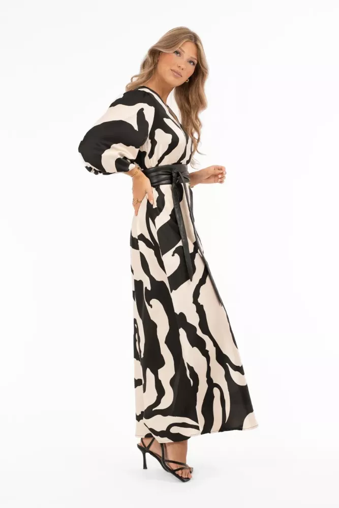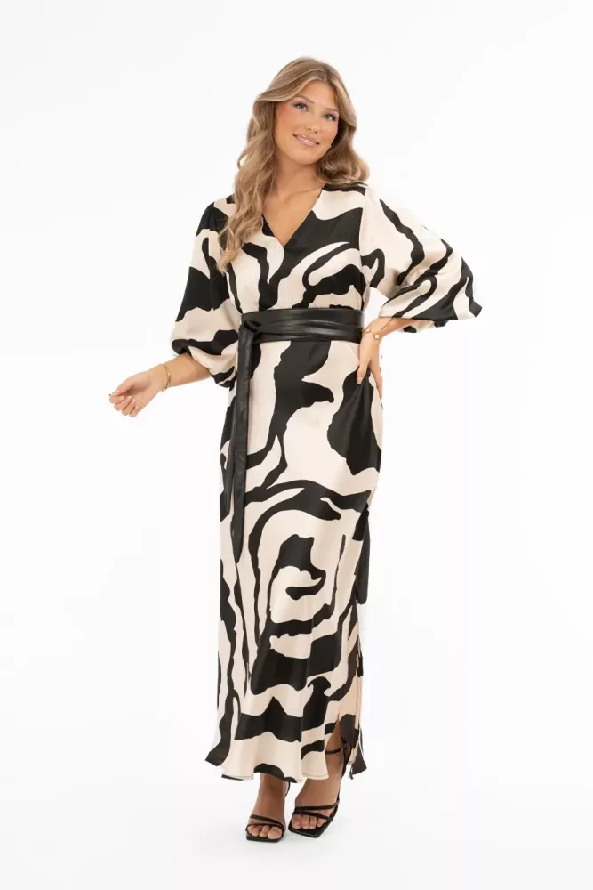 Elegant och feminin satinklänning med abstrakt mönster och puffärmar