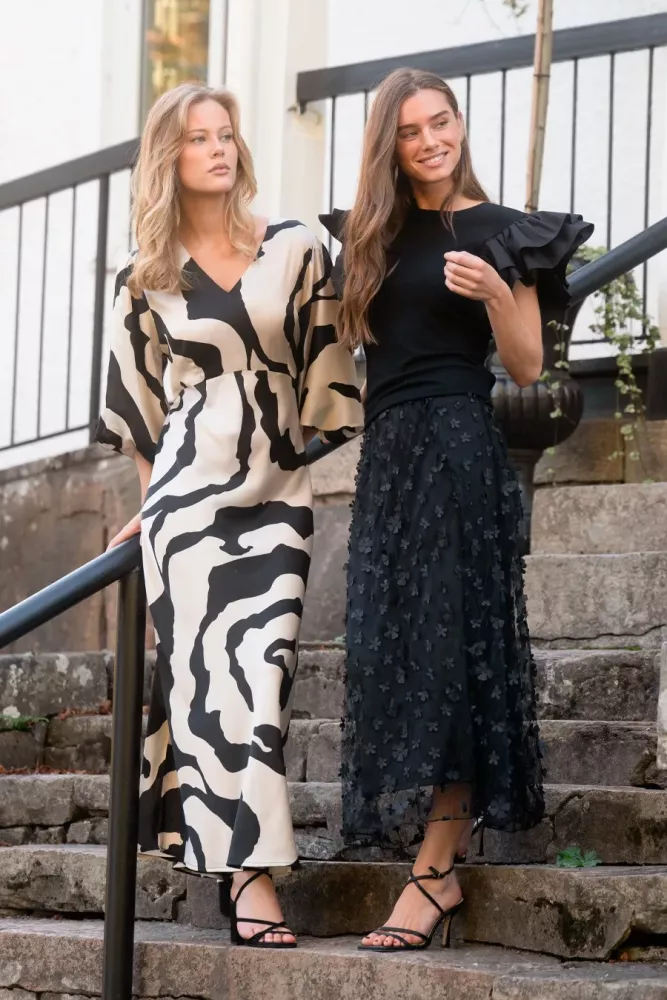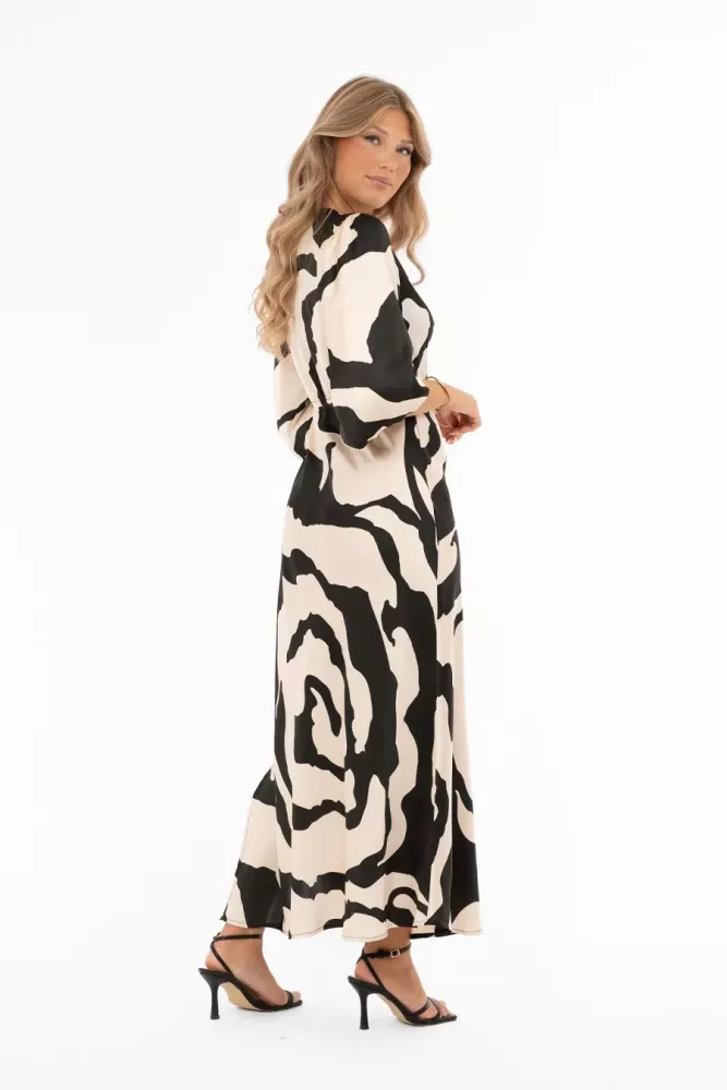 En elegant och feminin klänning med ett stilfullt abstrakt mönster och ett vackert fall. Den v-ringade halsen tillsammans med den lätt sluttande avskärningen under bysten skapar en smickrande siluett som framhäver figuren på ett mjukt och balanserat sätt. Insnitt framtill och resår baktill ger både form och komfort.