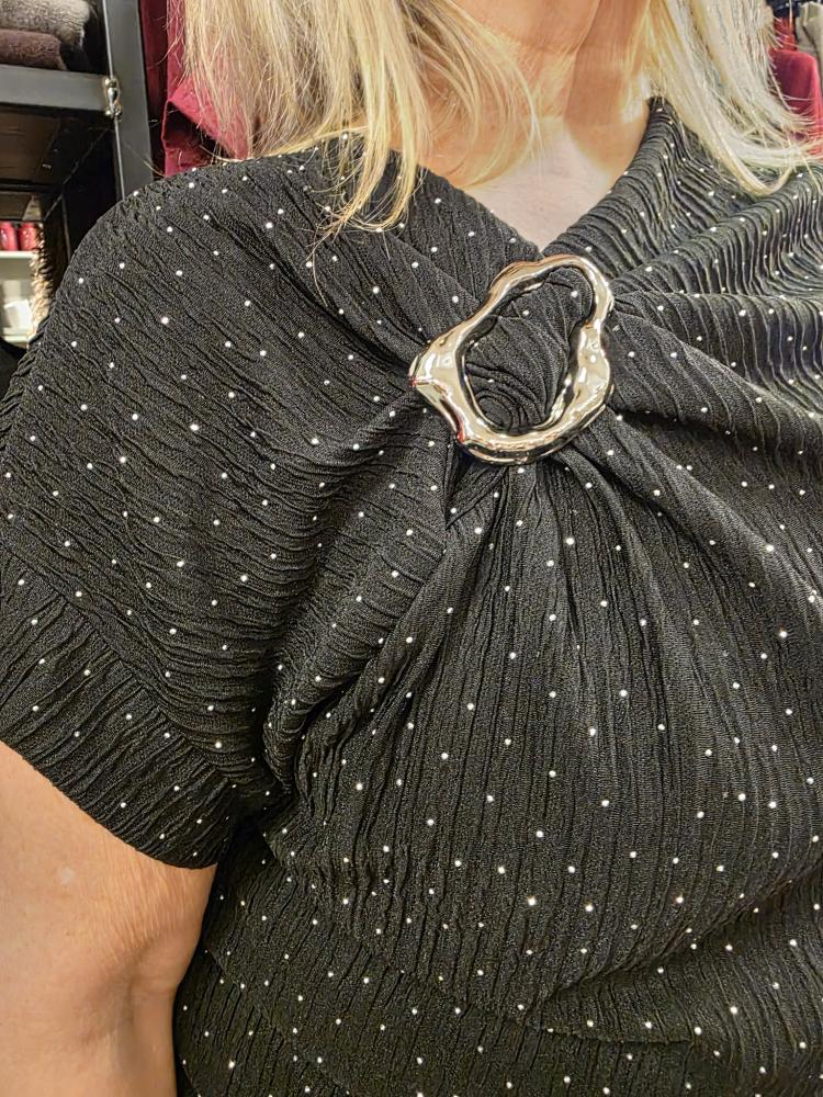 Svart kortärmad mjuk och stretchig klänning som glittrar i silver. Drapering strax under ena axeln, som hålls ihop av ett dekorativt silverfärgat spänne.